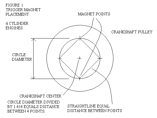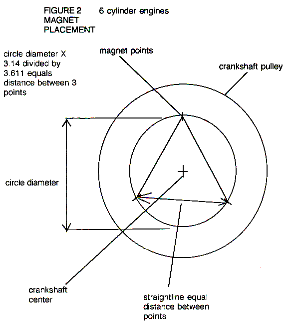 On six cylinder engines, the diameter of the scribed circle multiplied by 3.14 divided by 3.611 will give the dimension of 3 equidistant points along the scribed circle for magnet placement. See figures 1, 2 and 3 for clarification. If you are unsure of mounting the magnets accurately and properly, have the work performed by a qualified machinist. You must have proper clearance between the magnets and Hall sensor before turning over the engine. See section above.