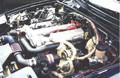 After using a Sebring Eaton M45 supercharger kit on the car for a while, Aaron needed more power, so he installed a system IV turbo kit from Bell Engineering Group Inc. This uses a Garrett T-28 compressor and T-25 turbine with integral wastegate. A BEGI intercooler and Mitsu 3000 GT blow off valve is fitted on the induction side. A Borla turbo muffler is used on the exhaust end.
