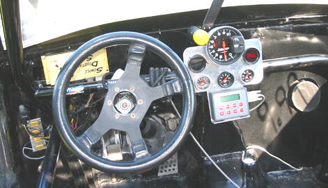 An SDS EM-4E/MSD does the fuel and spark control, 2 Bosch fuel pumps supply the methanol via a Holley fuel regulator to eight MSD 96lb. injectors. Power is 508hp at 20 psi, which blasts the 1715lb. (with driver), front wheel drive car to a 9.75 second 1/4 mile at 141.89 mph.