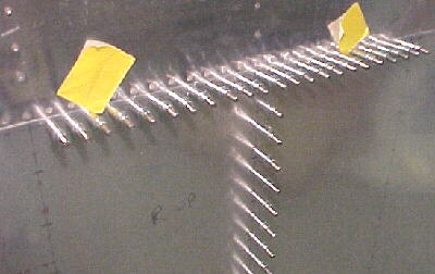 The wings skins as supplied by Van's were sheared very precisely. I measured and laid out the rivet spacing right on the skins. This takes nearly two hours per skin. They were taped in placed and drilled in a T pattern starting from the spar, outwards and downwards from the center.