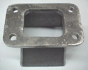 The collector is what merges the primary tubes into the turbine inlet. It needs to match the outer circumference of the primary tubes and the ID at the turbine flange needs to match the hole ID. It is constructed in 4 main parts, made from 1/8 to 3/16 plate stock which is then welded together. Later, 4 wedges wre cut from each corner and 45 degree triangles were added to help match the tube contours. Alternately, an 8 sided collector can be built or a hammer formed collector made. Hammer forming such thick plate is very time consuming! For Turbos with round inlet holes, a conical collector needs to be made. This entails cutting a paper template to simulate the size and shape and lots of cursing and swearing to heat and hammer form into the conical shape. We recommend that all parts be TIG welded to reduce warpage. Weld the turbine inlet flange to the collector.