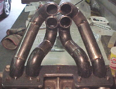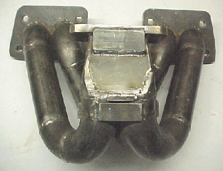 This header was constructed from 1 1/4 schedule 40 NSP weld els and tubing. The els are available from most industrial plumbing and gas fitting shops and are very inexpensive. They are made from a high strength, weldable alloy steel and have a nice V at each end to pour in a good, strong weld. They are available in 45 and 90 degree bends and short and standard radius styles. We recommend using the standard, longer radius ones whenever possible as they have less flow restriction. The els are also available in different IDs. The size describes the approximate ID, not the OD. The 1 1/4 ones are actually about 1 3/8 ID. Straight schedule 40 NSP tubing is used between els. These parts have a very thick wall thickness so the header will probably weigh as much as a heavy cast iron manifold. This thickness is necessary with non-stainless tubing for longevity at the high temperatures encountered. Standard mild steel header tubing will quickly self destruct if used for a turbo header. These materials have proved to last for several years of hard use on many engines including road racing applications.