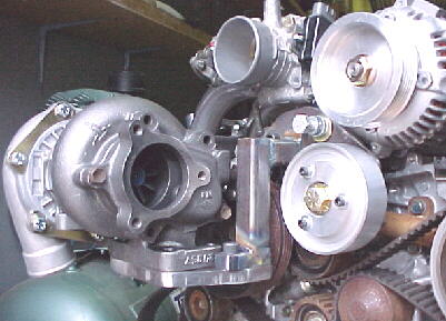 It was decided to rigidly mount the Garrett turbo to the engine and slip joint the 321 stainless pipes to allow for expansion. A turbine inlet flange was cut out of 1/2 inch mild steel. This flange incorporates threaded holes for the turbo mounts to attach to. The left mount was constructed from 1 inch, .125 wall square tubing and attaches to the block with two 8 X 1.25 bolts. The right mount was also made from the square tubing. It attached to the alternator mounting plate with two 3/8 NC Allen bolts.