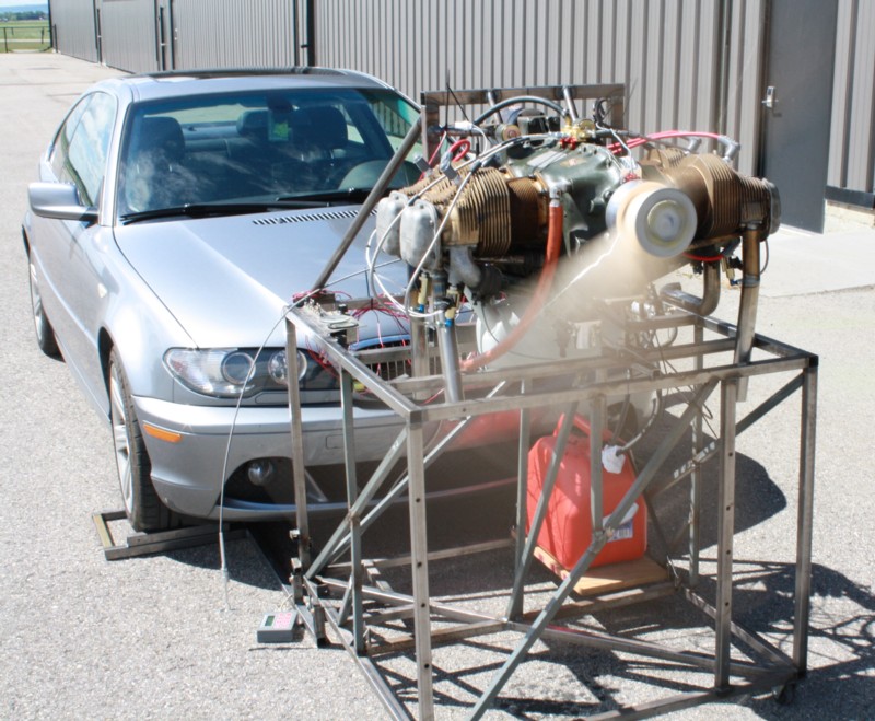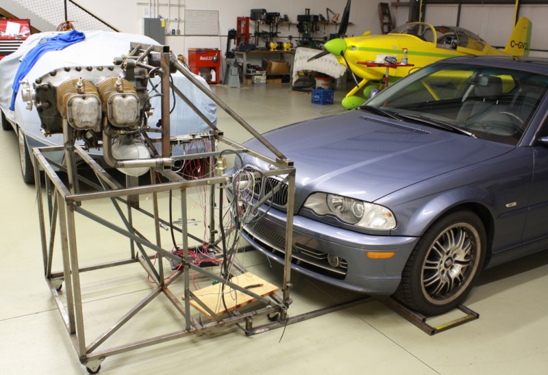 Engine with sump, plugs, fuel pump, starter installed and engine stand support arms fabbed. BMW is used for dead weight to keep the assembly from running away.