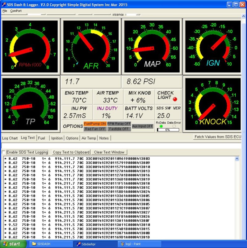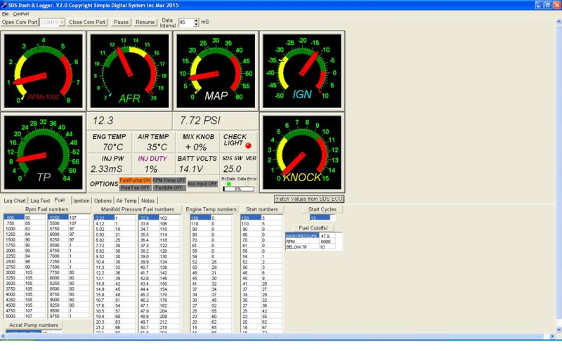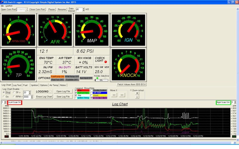 Plug in the data cable to your ECU and laptop. Open SDSDASHPR (torch icon). Start your engine. Click "Open Com Port" box in upper left.