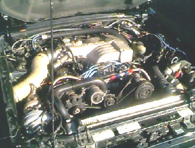 Turbos are Garrett TO3s mounted to 1.5 inch JBA headers. Exhaust flows out of the turbos through 2.5 inch mandrel bent tubing and Flowmaster 2 chamber mufflers. On the induction side, Russ used twin intercoolers, an Edelbrock Performer intake, BBK 70mm throttle body, K&N filters and 55 lb. injectors. A NOS Stage 2 nitrous system and NOS inline fuelpump supplies the combustibles.