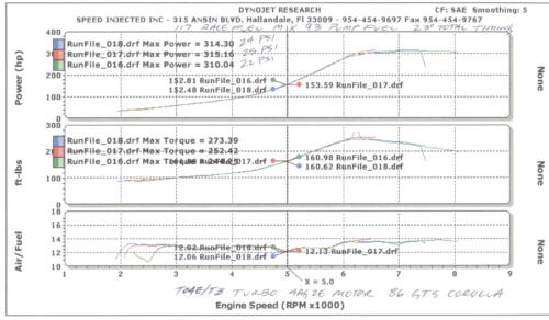 On the dyno it did a best of 289.3 hp and 230.2 ft/lb @18psi on 93 octane fuel. We managed a 315.1 hp and 273.4 ft/lb @ 24-25psi on 117 octane and 93 octane mixed fuel.