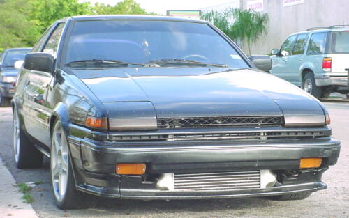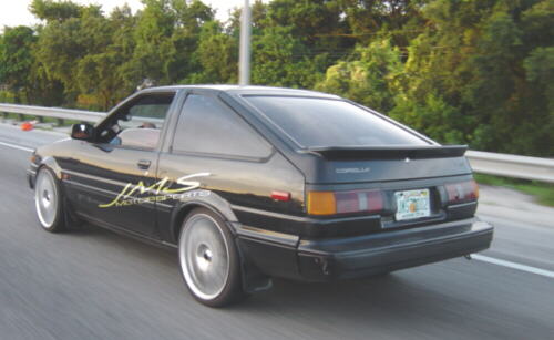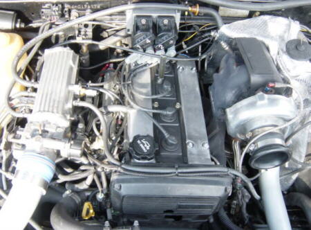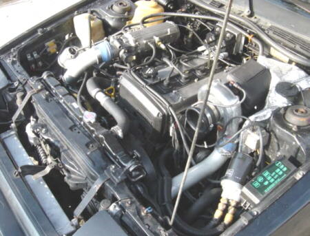 Power comes from a 4agze engine. Internals are completely stock except for a steel head gasket (from 95 1.8L Corolla) and a stainless steel o-ringed block. It runs an SDS EM-3 4F system with Toyota spark plug wires, and Denso Iridium spark plugs. The intake manifold is a front wheel drive unit (from an 88 Toyota Levin), modified to accept a 65mm Toyota throttle body in front, and a block off plate at the back. Custom cast steel turbo exhaust manifold, T04E/T3 Hybrid Garrett Turbo, HKS turbo velocity stack, 2.5" Downpipe, 3" custom exhaust system, Greddy muffler and mid silencer (both from a Twin Turbo Supra Greddy system), Turbonetics Delta Gate waste gate. The fuel system consists of four MSD 756cc injectors (72lb/hr) and Holley 255 LPH in tank fuel pump. Isuzu front mount intercooler, custom intercooler piping, HKS twin sequential blow off valve are also fitted.