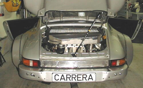 This car is based on a 1976 Carrera 3.0 shell. It has spent it’s last three years as turbo. Its engine is based on a 3.3 litre production turbocharged Porsche flat six. It is now twin plugged and uses an SDS EM-3 6F system with twin coil packs. Other engine modifications consistent with the performance of this type of vehicle have also been made, but nothing extraordinary. Fuel and air delivery is provided by a later style 3.2 liter Porsche intake manifold and RC Engineering injectors. Turbo charging is provided by a single Holset turbocharger. The intercooler was built using a significant Spearco core.