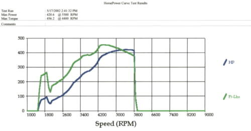 The car’s dyno chart shows 420 hp and 456ft-lbs at the wheels with approximately 0.9 bar (13 psi) of boost.