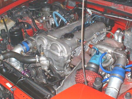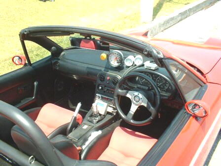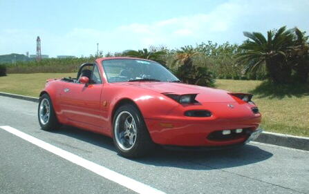 This Mazda Miata belongs to Vance Riley in Okinawa, Japan and is a daily driver. Motorworx took a 1600cc B6T from the Mazda Familia 4WD rally car to use as a base. The bores have been enlarged 4.5mm upping the displacement to 1732cc. Pistons are Arias forgings for the Toyota 4A-GZ. Sealing the combustion is a 1.6mm HKS head gasket. The head is stock except for HKS 264 degree intake and exhaust cams. On the intake side is a custom Motorworx intake manifold using the 60mm throttle body from a Nissan SR20DET. The turbo is a 60 trim T28 from the Nissan Pulsar GTI-R riding on an HKS cast iron exhaust manifold. Boost is regulated to the Innovative Turbo Systems external waste gate by a Greddy Profec B boost controller. The intercooler system is a custom Motorworx job using 2 cores from the Mazda FC3S RX7, all aluminum piping, and a Greddy BOV. Max boost is 1.5 bar, and the engine revs to 8,000 rpm. Engine management is an SDS EM3F V11 spraying Nippon Denso 700cc/min injectors, firing the stock Miata coils.