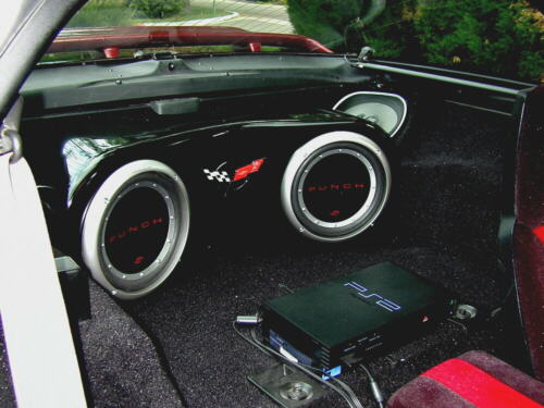 Inside it has a full course of Dynomat Extreme black carpet, custom black and burgundy seats and door panels, a Kennwood 8" touch screen T.V with navigation in the passenger side dash, a PS2 that runs on 12 volt ( no power inverter ) a Kennwood Excelon cd mp3 wma head unit, a Kennwood 5 channel 1200 watt amp, 2 Infinity 6" in the doors and 2- 6x9's in the back, 2 - 10" Rockford Fosgate subs in a custom ½ " thick fiberglass sub box. This car has been a 2yr project that is finally complete (for now).