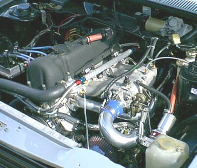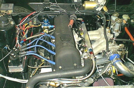 Power comes from an L18 fitted with KA24 turbo pistons and L16 rods, resulting in a CR of around 8.5 to 1. Other mods include 30Lb. injectors, Apexi blow off valve, Blitz boost controller, lightened flywheel and an SDS EM-3 4F engine management system.