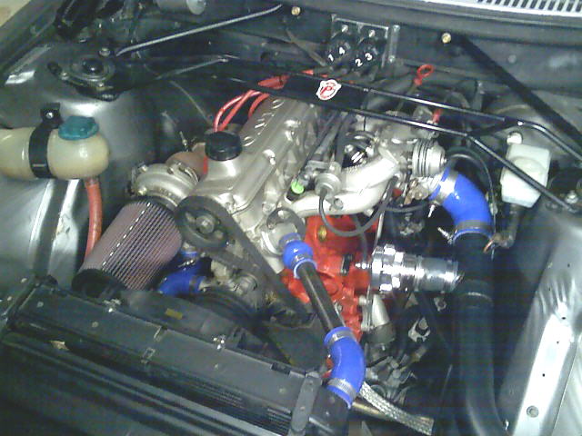 The car originally had a N/A engine and AW70 automatic. The former was ditched in favor of a 91 B230FT and a M-47 5 speed. More recently that combination has evolved into a stroked out short block with a offset ground B230 crankshaft slinging Eagle H-beam rods and JE forged dish pistons. The head is ported and exhaust valves were enlarged from 35 to 38mm. The head also now houses a stock volvo grind K camshaft that checks in at .471" of lift, 230* intake duration and 226* exhaust duration at .050". Overlap is a whopping 38* which puts the idle vacuum rather low ( 10''-12"hg). The engine now checks in at just under 2.5 litres with the additional stroke. The stock exhaust manifold has been port matched and opened generously to accept a traditional T-3 hot side. The turbo is a journal bearing Garrett GT-35, complete with an internal wastegate and a 4.25" v-band exhaust exit.