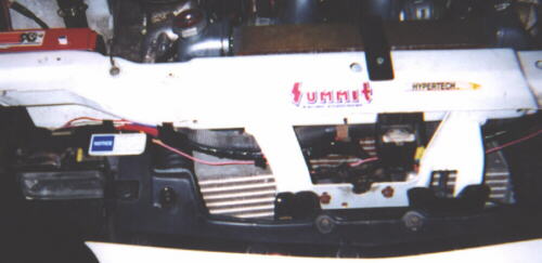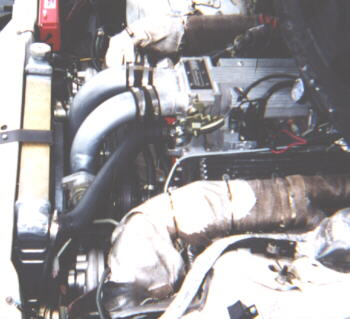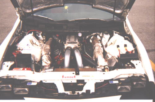 Power comes from a Chevy 350, balanced, steel crank, 8.0 to 1 forged pistons and forged connecting rods. Turbos are twin 16G, twin intercoolers from a stock Eagle Talon, headers are custom made, 72 lb. injectors are run by an SDS EM-3 8E. Boost is currently set at 10 psi.