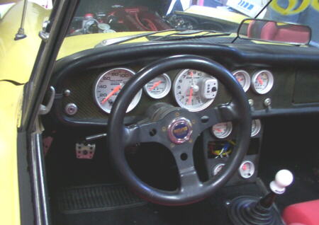 Autometer gauges are mounted in a custom carbon fiber dash. The car sits on a set of 16" RG wheels. Next modifications will be fitting Porsche 944 turbo front and Skyline GT-R rear brakes.