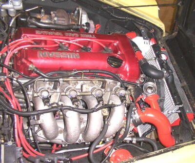 The motor is an S13 SR20det from a '92 Nissan Silvia, fitted with a T3/T4 hybrid turbo. Custom plumbing runs through a Starion intercooler up to the stock throttle body. A Tial external wastegate and HKS blow off valve are fitted along with a full 2.5 mandrel exhaust that runs along the frame then up and over the rear axle exiting through a stainless Supertrapp. The SDS EM-3 4F computer is mounted up in the driverside kick panel. The engine is running at eight pounds of boost.