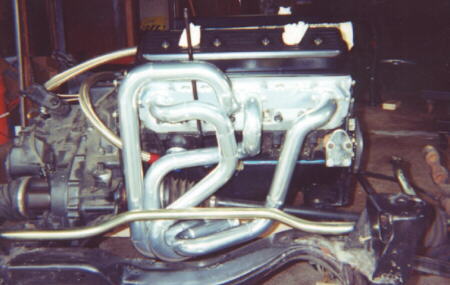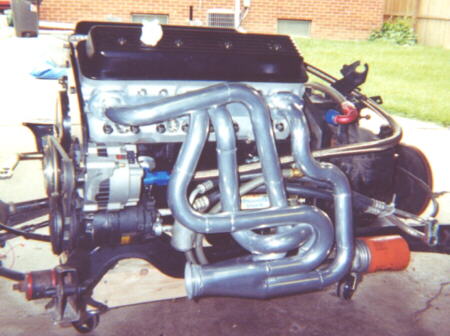 Transmission is a stock Fiero Getrag 282 5-speed with adaptor plate to mount engine, Clutchnet clutch (double spring pressure plate), intermediate shaft (from Chevy Beretta FWD) w/ almost equal length axles (stock Fiero uses no intermediate shaft with right side axle more than double the length of the left axle).