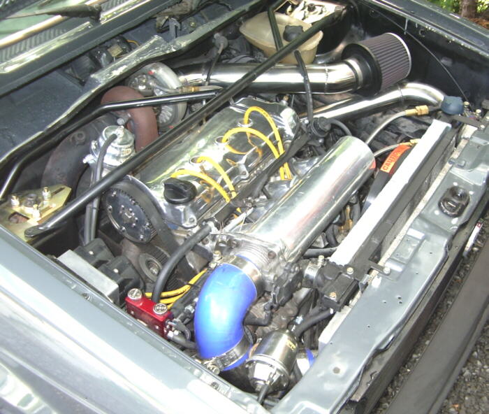 Power comes from a 9A with stock rods and pistons, a copper head gasket to lower the CR to 7.8 to 1, home made aluminum intake, 900 cc injectors, controlled by an SDS EM-4 4F, Garrett T3/T4 turbo, TIAL bov 50 mm, and 40mm waste gate and TT Cam gear.