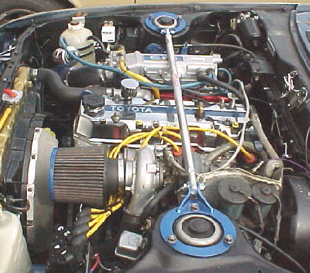 This car is owned by Romel Tenchavez in Calgary, Alberta, Canada. Power comes from a 22R fitted with 7.2 Mahle forged pistons and a Fel-Pro head gasket. Most of the other internals are stock. The turbo is a Garrett T4/T3 hybrid using a T-5 compressor and a standard .63 exhaust end and dumps through a 2.5 inch exhaust. 440cc injectors are used and an EM-2 4F system controls the fuel and spark. The blow off valve is HKS and the intercooler is a Speaco unit with custom fabbed tanks. The car has run a best 1/4 mile of 14.8@99.2 mph on narrow street rubber at 12 psi with the factory a/c in place and a 50 pound, 8 speaker, Alpine stereo system