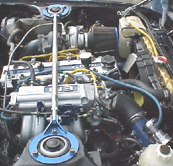 The car runs on 205/50/15 Ventus radials mounted on 15 X 7 Panasport wheels. Shocks are Tokico adjustables. Springs are Suspension Techniques with a 1.5 inch drop. A larger rear sway bar is fitted. The diff is Corolla GTS LSD unit with 4.30 gears and the car is fitted with a front strut brace.