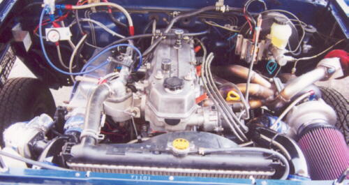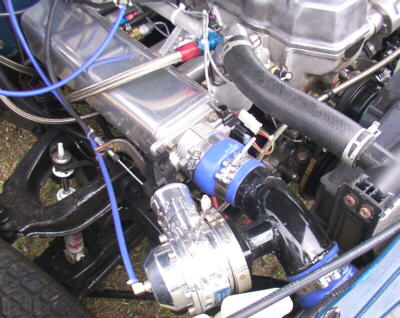 David fabbed the 304 stainless turbo manifold with 1 5/8 primaries and the 3" downpipe with the intercooler piping at 2.5" diameter. The Turbo is a Turbonetics 60-1 with a .81 AR and a P-trim wheel. Wastegate is a Turbonetics racegate and the blowoff valve is a Turbonetics Godzilla. Transmission is stock with a LC Engineering pro-metallic clutch. The rear end houses 4.30 gears. Dave has made over 50 passes on it since spring and has only had to change the spark plugs!