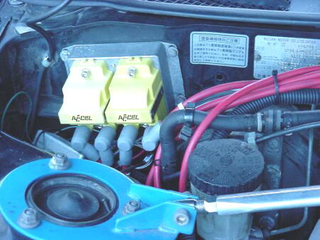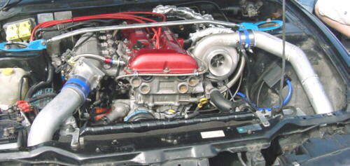 The engine is a Nissan SR20 2.0 liter with stock bore Wiseco forged pistons. Cams are Tomei 270 degree solid pivot in the intake and exhaust with HKS adjustable slide sprockets. The head gasket is HKS 1.2mm. ARP head, main, and rod bolts. The squish, or quench area has been removed from the combustion chambers to decrease compression and reduce knock. The intake manifold is from Trust/GReddy, and modified for a Holley, Ford Mustang 70mm throttle.