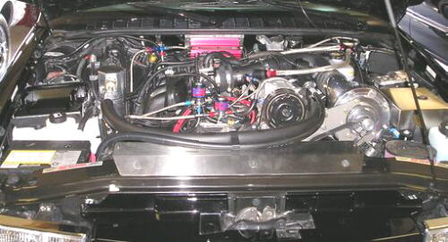 Power comes from a 2.2L 134 CID 4 cylinder engine fitted with a custom supercharger running 6 psi, SDS Extra Injector Controller firing two 480cc injectors, Nitrous Express wet kit set at 35 hp, MSD DIS-2 ignition box, custom header with 1.75 inch primaries, a catalytic converter delete using a Caspers Electronics 02 sensor simulator and a 2.5 inch exhaust with Flowmaster 40 series muffler. Russel fittings and hose detail the engine bay. Mixture is monitored by a Innovate Motorsports LM-1 wideband 02 sensor and fuel, nitrous and boost by Autometer Ultra-Lite: gauges.