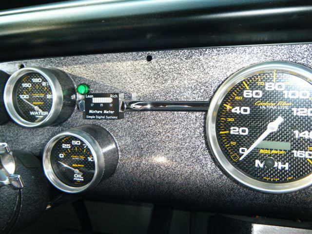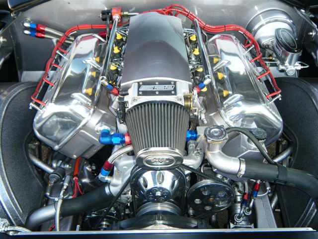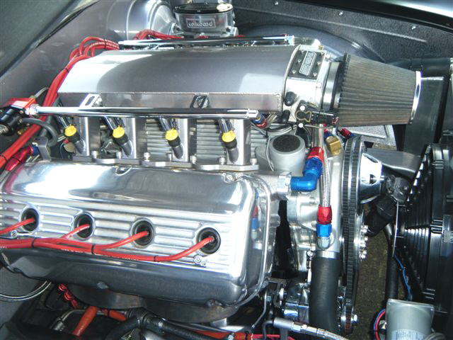 Engine is a 1956 392 cu in Chrysler hemi complete with 9.25:1 Venolia pistons, stock crank and rods. Isky 280 HYD cam, owner-built sheet metal intake manifold with 36 lb/hr accel injectors and 58 mm BBK throttle body. Spark and fuel controlled by SDS EM4-8V11 and MSD-6AL.