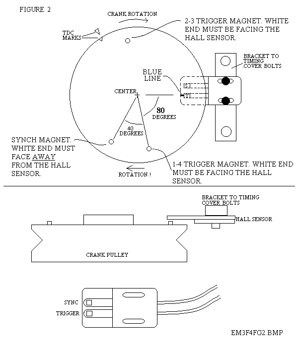 The F4 system uses 2 magnets spaced 180 degrees apart for triggering and 1 synch magnet spaced 40 degrees ADVANCED in the direction of crank rotation of the first (1-4) trigger magnet. See figs 1 and 2.