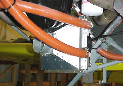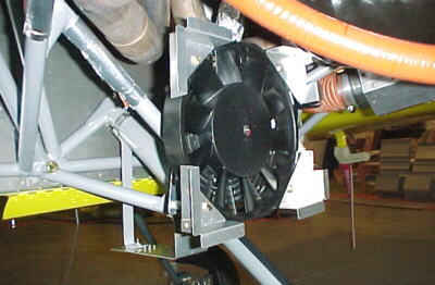 Finally have most of the parts to do the cooling system work. A Spal 440 cfm electric fan and aluminum Ford van heater core are mounted off the nose gear / engine mount and fed via a 3inch duct and SCAT hose. Total rad area is 130 square inches, total rad voume is 321 cubic inches.