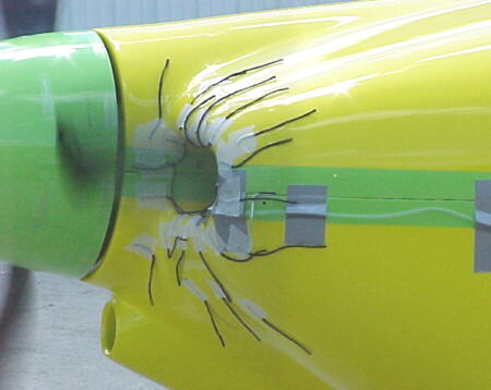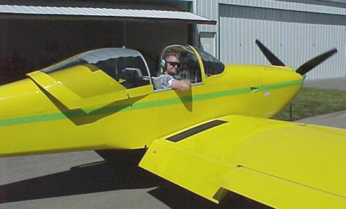 Have finally made it out on the runway for fast taxi tests. Initial tests uncovered a severe landing gear harmonic and vibration. There has always been a high frequency harmonic coming from the left landing gear leg even at walking pace. This was erroneously attributed to the wheel pant mounting plates vibrating but was still there with the pants installed. Out on the runway at 20-30 knots, the high frequency vibration turned to a lower frequency, high amplitude vibration which felt like the aircraft would come apart. We retired to the hangar, lowered the tire pressures from 35 to 25 on the main gear, tested the nose fork breakout force to eliminate nose wheel shimmy as a possible cause, then taped a 1 X 2 spruce strip onto each main gear leg. When we went out again, the vibration was 95% cured. Van's suggested in the plans to build these wooden dampening strips. These are VERY important on my aircraft although there are apparently many RVs flying with none and having no problems. Many people are under the impression that these are stiffeners. They actually have a minimal effect on stiffening the leg. Wood is used to dampen the natural harmonic because it has a different modulus than spring steel. The idea is to change the natural harmonic frequency of the leg to a range either above or below where it would occur under standard useage.