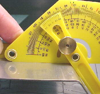 The next job was to measure for wing rake and incidence angle. I made up an aluminum sheet gauge to tape to the wing as per the manual for determining the incidence angle. After levelling the fuselage at the canopy rail mounts (0 degress on left side, .2 degrees on right side), I drew a line on the rear spar joints close to the fuselage.