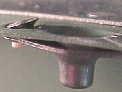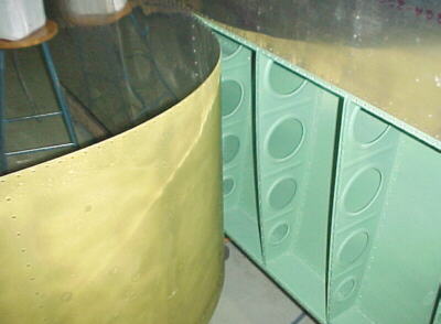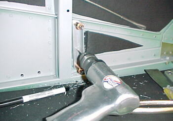 The skin is rolled away from the structure to allow access for the bucking bar. Some rivets are hard to see and a mirror is handy to check the formed head.