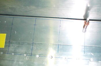 The wings skins as supplied by Van's were sheared very precisely. I measured and laid out the rivet spacing right on the skins. This takes nearly two hours per skin. They were taped in placed and drilled in a T pattern starting from the spar, outwards and downwards from the center.