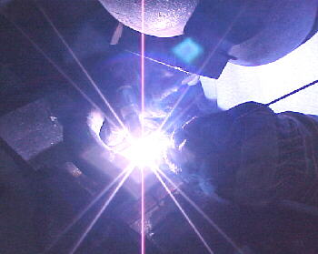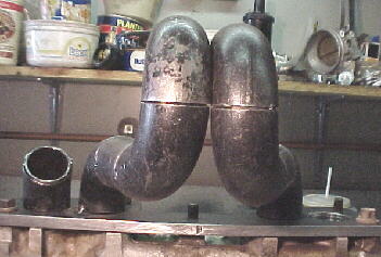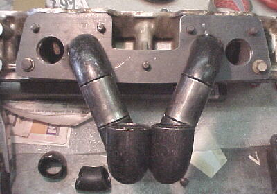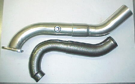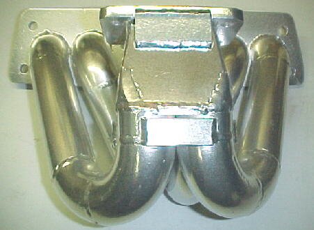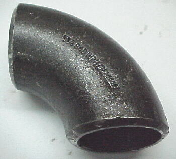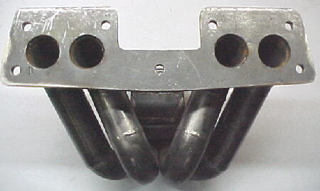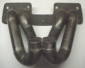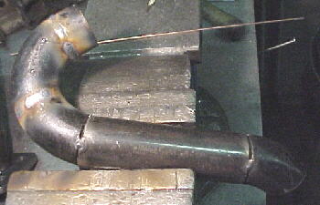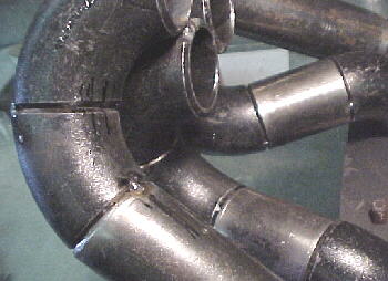 This header was constructed from 1 1/4 schedule 40 NSP weld els and tubing. The els are available from most industrial plumbing and gas fitting shops and are very inexpensive. They are made from a high strength, weldable alloy steel and have a nice V at each end to pour in a good, strong weld. They are available in 45 and 90 degree bends and short and standard radius styles. We recommend using the standard, longer radius ones whenever possible as they have less flow restriction. The els are also available in different IDs. The size describes the approximate ID, not the OD. The 1 1/4 ones are actually about 1 3/8 ID. Straight schedule 40 NSP tubing is used between els. These parts have a very thick wall thickness so the header will probably weigh as much as a heavy cast iron manifold. This thickness is necessary with non-stainless tubing for longevity at the high temperatures encountered. Standard mild steel header tubing will quickly self destruct if used for a turbo header. These materials have proved to last for several years of hard use on many engines including road racing applications.