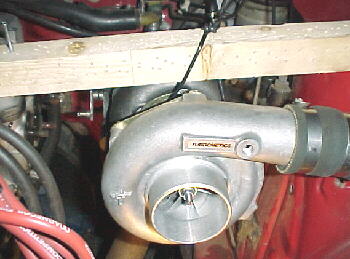 T4/T3 hybrid turbo with H3 compressor, stage 3, .63 exhaust, ceramic coated. A twin port, wastegate actuator is used for cockpit adjustable boost via an inexpensive pneumatic regulator.
