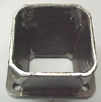 The collector is what merges the primary tubes into the turbine inlet. It needs to match the outer circumference of the primary tubes and the ID at the turbine flange needs to match the hole ID. It is constructed in 4 main parts, made from 1/8 to 3/16 plate stock which is then welded together. Later, 4 wedges wre cut from each corner and 45 degree triangles were added to help match the tube contours. Alternately, an 8 sided collector can be built or a hammer formed collector made. Hammer forming such thick plate is very time consuming! For Turbos with round inlet holes, a conical collector needs to be made. This entails cutting a paper template to simulate the size and shape and lots of cursing and swearing to heat and hammer form into the conical shape. We recommend that all parts be TIG welded to reduce warpage. Weld the turbine inlet flange to the collector.