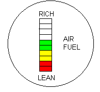 Spark ignited engines will produce the desired performance only within a relatively narrow range of AFRs. Best power is usually obtained with an AFR of between 11.8 and 13.0 on most engines. The lowest average emissions are obtained with the AFR around 14.7 to 1 (stoichiometric) and best fuel economy is at AFRs between 16 and 18 to 1. Most engines do not idle happily unless they are setup to run richer than 14 to 1 AFR. You can check the AFR vs. LED sheet supplied with your meter to get an idea of what AFR you are running at. The basics are shown below: